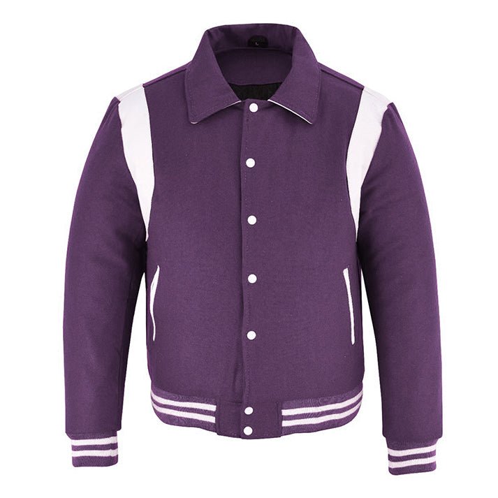 Be the first to review “Classic Varsity Letterman Baseball College Purple Wool With White Single Leather Strip Jacket”
