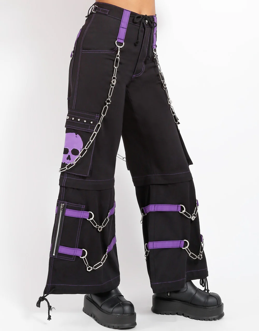 Details and Composition:  Eyelet, Zipper, D-Hook And Chain Composition: The presence of eyelets, zippers, D-hooks, and chains adds a stylish and edgy touch to the pants, contributing to their unique design.