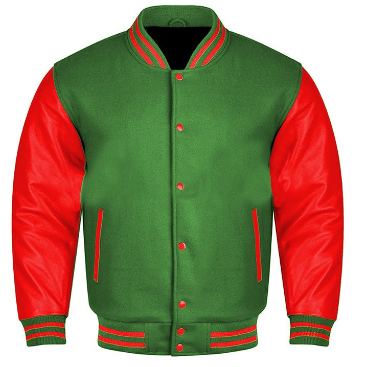 (green and red varsity jacket) Letterman Jacket Custom- a perfect blend of style, Perfect for any occasion, this jacket exudes timeless charm and sophistication. Expertly crafted with quality materials, it’s a must-have for any fashion-forward individual.