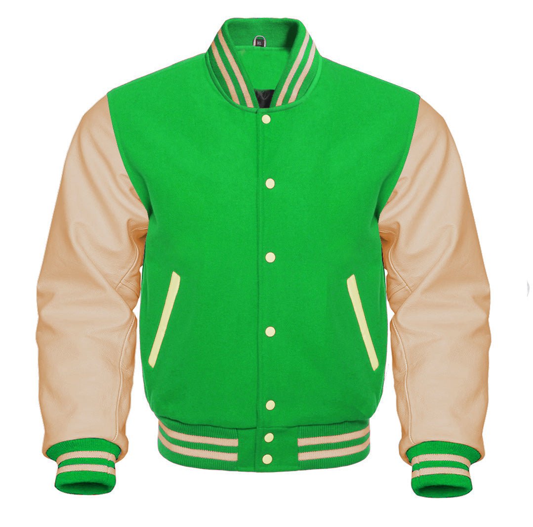 (Green and white varsity jacket​) Letterman Jacket Custom- a perfect blend of style, Perfect for any occasion, this jacket exudes timeless charm and sophistication. Expertly crafted with quality materials, it’s a must-have for any fashion-forward individual.