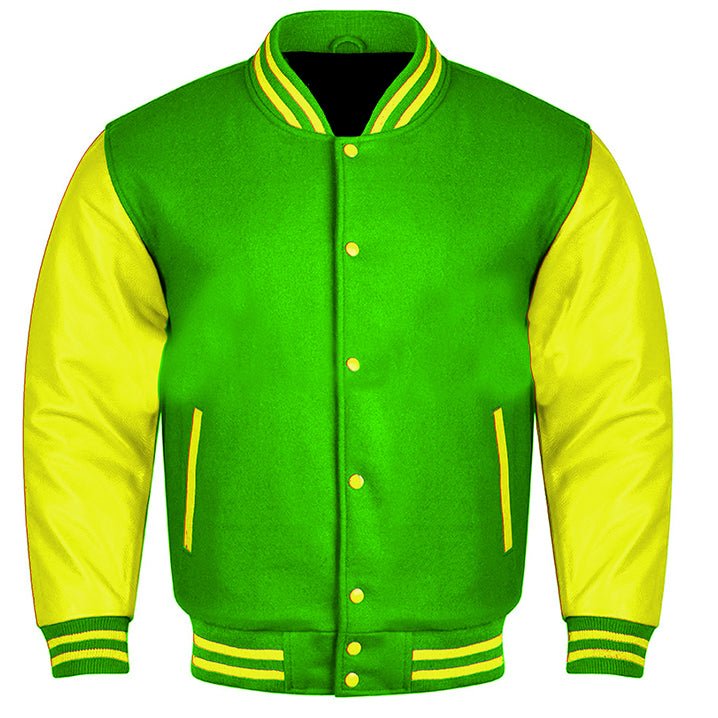 (green and yellow letterman jacket​) Letterman Jacket Custom – a perfect blend of style, Perfect for any occasion, this jacket exudes timeless charm and sophistication. Expertly crafted with quality materials, it’s a must-have for any fashion-forward individual.