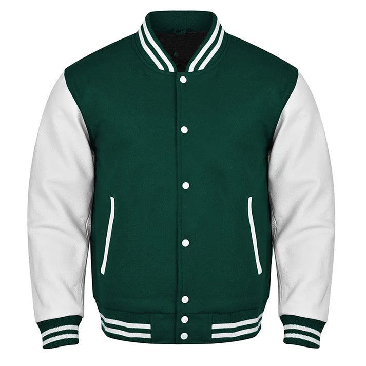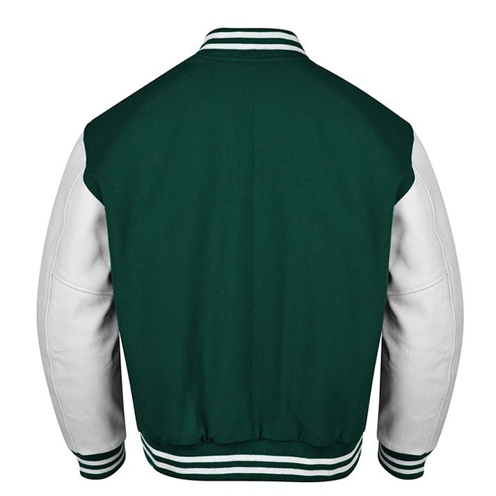 (green white varsity jacket​) Letterman Jacket Custom – a perfect blend of style, Perfect for any occasion, this jacket exudes timeless charm and sophistication. Expertly crafted with quality materials, it’s a must-have for any fashion-forward individual.
